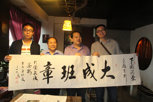 重慶著名書法家戴三七(左二)現(xiàn)場題字“大成班章”