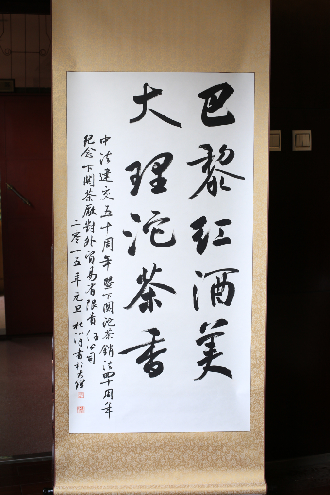 為慶祝中法建交50周年,中國郵票總公司和法國郵政局聯合發行了兩枚以巴黎塞納河和中國南京秦淮河為主圖案的紀念郵票2萬套,中國上海造幣廠和法國制幣局共同制作發行了慶祝中國建交50周年的紀念幣2萬套。作為首家打開法國市場的中國茶葉企業,下關沱茶在此次的中法建交50周年紀念活動中有著特殊的地位,經與法國駐華大使館及相關部門協商,確定由下關沱茶生產慶祝中法建交50周年特制禮品茶2萬套,法國駐華大使館文化參贊周子牧先生還親自為紀念茶題寫了:“巴黎紅酒美,大理沱茶香!”的中文題詞。近期,下關沱茶將在秦淮河畔舉行一場慶祝中法建交50周年沱茶首發儀式及相關茶文化活動。