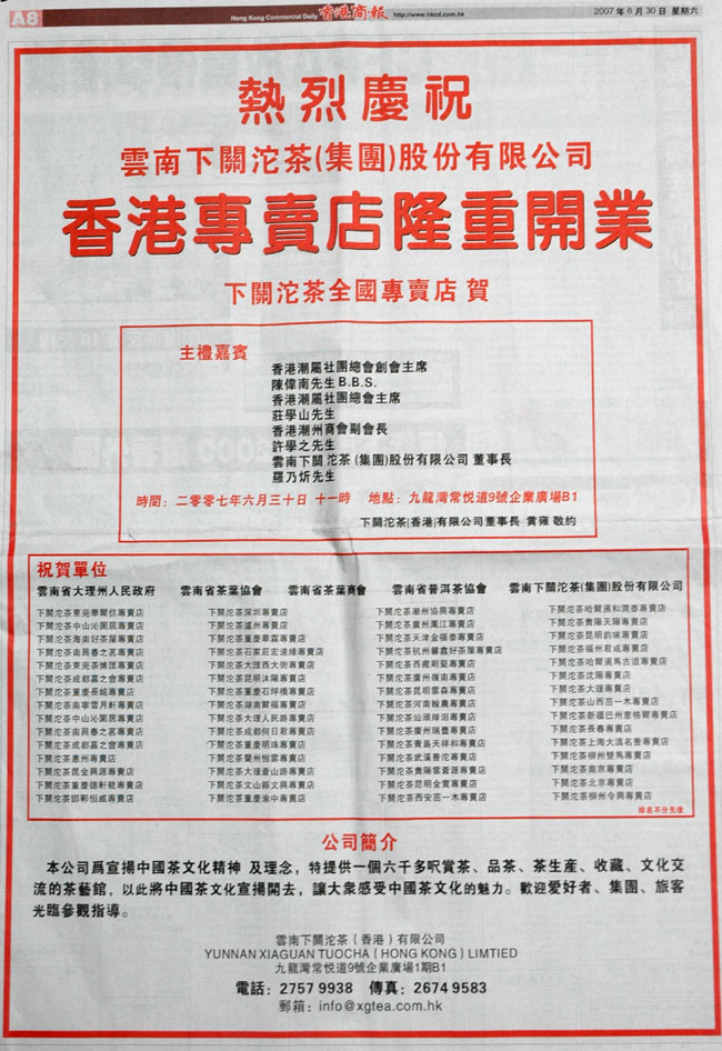 2007年6月30日,在喜迎香港回歸祖國十周年喜慶節日前夕,云南下關沱茶位於香港九龍灣企業廣?鲆黃?B1的大型專賣店舉行隆重的開業慶典,云南下關沱茶(集團)股份有限公司董事?L羅乃?約跋愀鄱轡活I導?W?R主禮,下關沱茶各地專賣店代表亦到?鮒?慶。開業慶典上進行了醒?{表演,?鶻y中??茶道示范,古?~演奏等助慶活動,??面隆重熱?[,充?M喜慶氣氛!
