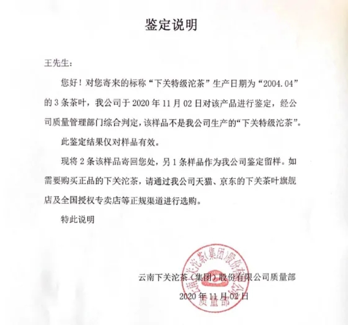 2020年11月2日,我公司收到王先生郵寄來的標稱為“下關特級沱茶”生產日期標注為“2004年4月”的茶葉3條,收到樣品后,公司質量管理部們組織相關技術人員對照公司留樣,進行比對鑒定。經過多要素綜合判定,最終確定該樣品不屬于我公司生產的下關特級沱茶,是假冒偽劣產品。