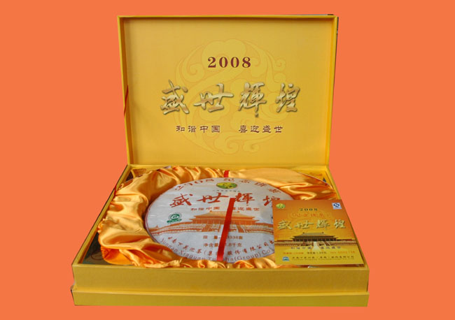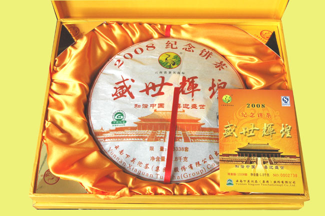 風花雪月地,銀蒼玉洱茶。下關沱茶集團公司最近出品的“盛世輝煌”紀念禮茶,選用云南大葉種之高檔曬青茶為原料,按傳統配方拼配,充分利用“下關風”特有的干燥作用和“蒼山雪”天然礦泉水優勢,經蒸揉,殺菌等現代工藝制成,香氣馥郁,濃厚持久,湯色橙黃明亮,滋味醇爽回甘,飲之清涼解渴,幫助消化,祛除疲勞,心曠神怡。此款禮茶僅限量生產13338套,是中秋佳節品飲、送禮、典藏之佳茗。