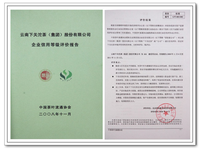 最近,在食品安全再次成為黨和政府下大力重點(diǎn)整治的中心工作的市場環(huán)境狀況下,從中國茶葉流通協(xié)會傳來佳音:在全國整頓和規(guī)范市場經(jīng)濟(jì)秩序行業(yè)信用評價(jià)中,云南下關(guān)沱茶(集團(tuán))股份有限公司被評為AAA級信用企業(yè)!
