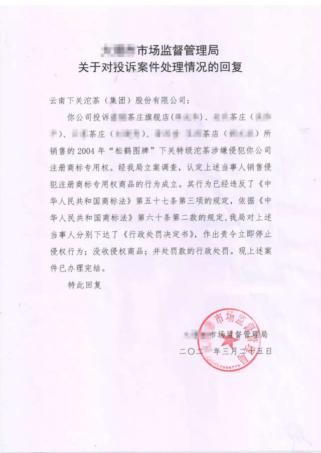 近日,我司在市場上發(fā)現(xiàn)有標(biāo)稱我公司生產(chǎn)的生產(chǎn)日期為2004年4月的松鶴圖牌“下關(guān)特級沱茶”,該產(chǎn)品經(jīng)鑒定屬于侵犯公司注冊商標(biāo)專用權(quán)的假冒產(chǎn)品,不屬于我公司生產(chǎn)。同時(shí),我公司將目前發(fā)現(xiàn)的銷售該假冒產(chǎn)品的經(jīng)銷商投訴至市場監(jiān)管局,經(jīng)市場監(jiān)管局立案調(diào)查后認(rèn)定其銷售侵犯注冊商標(biāo)專用權(quán)的行為成立。